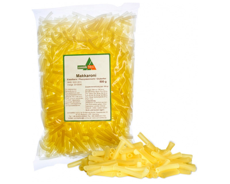 Suitable for the Dietary Management of Phenylketonuria and Hyperphenylalaninemia. Low in protein and low in Phenylalanine. Gluten free. Ingredients: Corn starch, corn flour, emulsifier: mono- and diglycerides of fatty acids. Nutrition Facts per 100 g: • Energy: 1541 kJ; 363 kcal • Protein 0,4 g of which o Phenylalanine: 20 mg o Tyrosine: 13 mg o Lysine: 18 mg o Methionine: 8 mg o Leucine: 61 mg o Isoleucine: 23 mg o Valine: 60 mg o Threonine: 15 mg • Carbohydrates: 87,0 g • Fat: 1,5 g