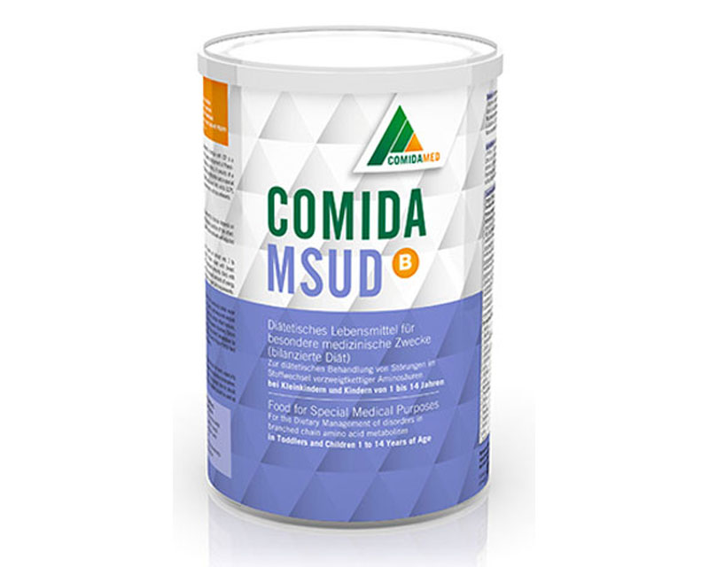 comida-MSUD B consists of a concentrated amino acid mixture free from Leucine, Isoleucine and Valine, supplemented with micronutrients according to current recommended dietary intakes for infants (DACH; SCF; DRI).