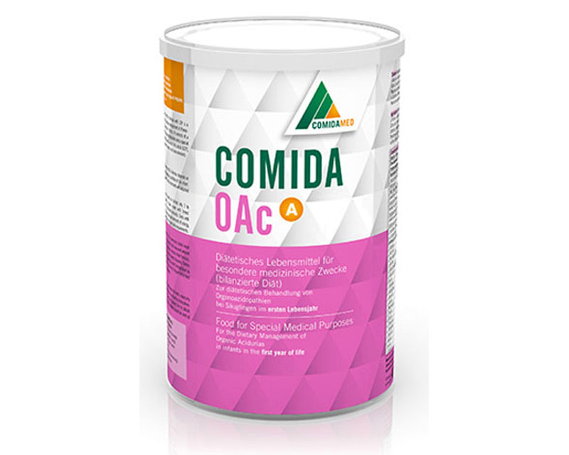 comida-OAc A concentrated amino acid mixture, free from Methionine, Valine, Threonine and Isoleucine, supplemented with micronutrients according to current recommended dietary intakes for infants (DACH; SCF; DRI).