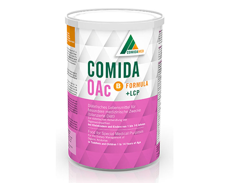 comida-OAc B formula consists of a special formula free from isoleucine, methionine, threonine, and valine, containing omega-3, omega-6 fatty acids and carbohydrates according to current international recommended dietary intakes for children (DACH; SCF; DRI).