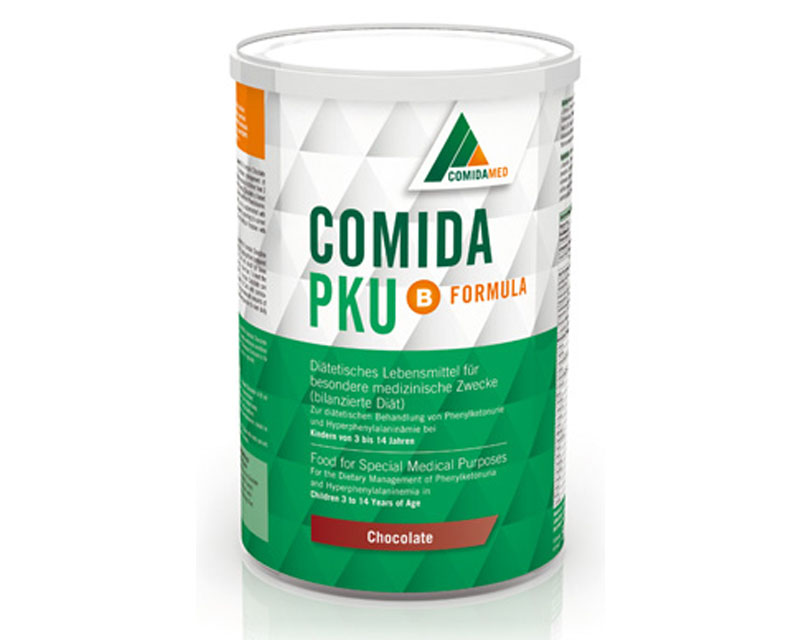 comida-PKU B formula Chocolate consists of a special formula free from Phenylalanine, containing omega-3, omega-6 fatty acids and carbohydrates according to current international recommended dietary intakes for children (DACH; SCF; DRI).