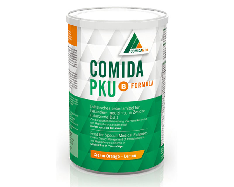 comida-PKU B formula cream ORANGE-Lemon consists of a special formula free from Phenylalanine, containing omega-3, omega-6 fatty acids and carbohydrates according to current international recommended dietary intakes for children (DACH; SCF; DRI).