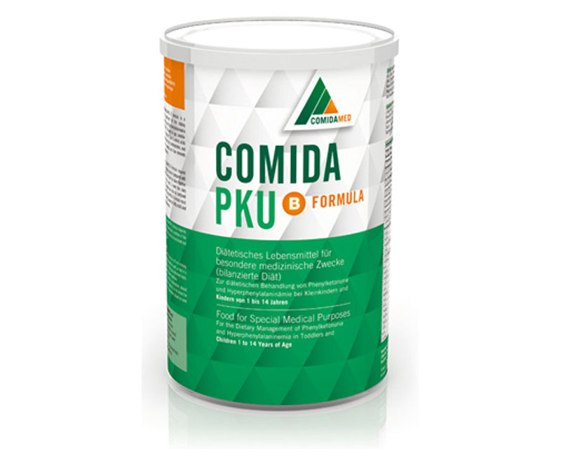 comida-PKU B formula consists of a special formula free from Phenylalanine, containing omega-3, omega-6 fatty acids and carbohydrates according to current international recommended dietary intakes for children (DACH; SCF; DRI).